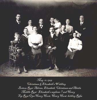 ELIZABETH HORST Elizabeth was born in Amsterdam, The Netherlands on April 2, 1880 to Heinrich S. Horst 1842- 1925 (son of Hein Gerrit Horst) and Hendrika Johanna Elizabeth Koppel. Her older brother, Heinrich S.G.N. Horst (1874 - 1951) came to Canada in 1907, followed 5 months later by his father, his sister Elizabeth and his children. Elizabeth was obliviously there to care for her nephews, Henri and John and her niece Rika. In Elizabeth and Christiaan's wedding picture, Opa Horst is the man with the white mustache; Elizabeth's brother Heinrich holds Rika; her nephew Henri has his hand on Chris' shoulder and her nephew John stands behind her. Several years after Elizabeth and Christiaan's marriage, Heinrich and his children moved to Shackleton, Saskatchewan where some family members still live in the area. Others moved back to British Columbia and are in the Kelowna and Lower Mainland areas. Opa Horst made his home with Elizabeth and Chris until his death in 1925. He is buried at the Mountain View Cemetary in Vancouver. |