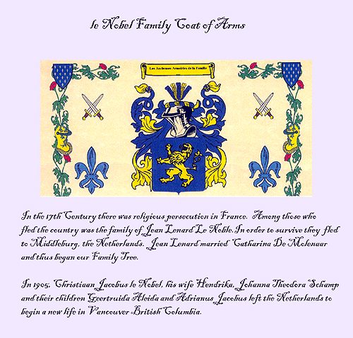 "Branch a) is not very well known. Apart from "merchants" nothing is known about their trades or professions. Until the 7th generation it was very vulnerable to extinction. Thanks to Christiaan Jacobus leNobel (1872-1967) "Chris", it survived. Chris and his wife Theodora (Dora) came to Canada in 1905." Their children and the children of his second wife Elizabeth make up the 8th generation. "The Cousins" are the ninth generation. There are six leNobel boys in the tenth generation so the family will continue on this side of the Atlantic.