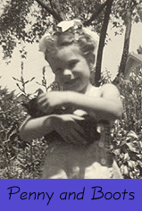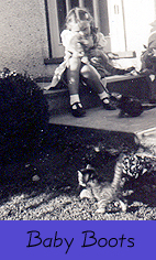 | Boots was a small tabby cat with white paws - so, the very original name of Boots. She was Penny's first kitten - the first of many. When Boots was about to give birth to her own kittens, GeeGee, horrified that her little daughter might see such a thing, arranged for the neighbours to go on a picnic (GeeGee supplied all the food) and to take Penny with them. So when Penny came home - behold - new kits! |